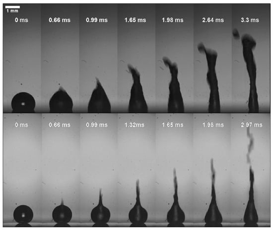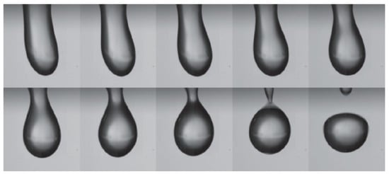 where is the velocity of the jet, is the jet radius, and is surface tension of the fluid. Tan et al. [] have observed that the onset of jetting and the transition from single droplet pinch-off to multiple droplets formation occur universally at jet Weber numbers of 0.1 and 0.4, respectively, as a consequence of the axisymmetric breakup of the jet due to Plateau– Rayleigh instability. Further illustration is provided in Figure 1g.