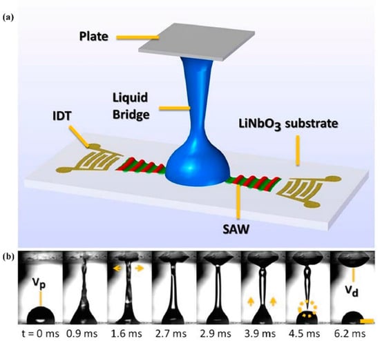 Bhattacharjee et al. [] demonstrated that for low viscosity fluids, SAWs can be utilized to rapidly generate liquid bridges, which is seven times faster than current methods. In addition, with the reduction in the viscosity of the fluids, the duration for the liquid bridge to fragment into droplets also diminishes. Castro et al. [] conducted an investigation on the formation of liquid bridges with varying viscosities ranging from 1.005 to 26.613 cP. They found that the increase in viscosity led to a decrease in the expansion and contraction of the impact film on the top plate. This outcome is similar to that of a decrease in the pulse width.