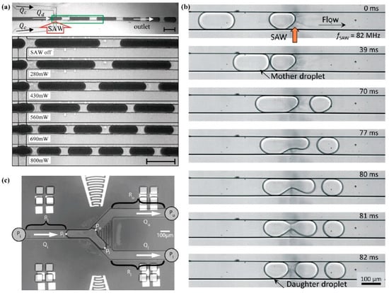 - Schmid, L.; Franke, T. SAW-controlled drop size for flow focusing. Lab Chip 2013, 13, 1691–1694. [Google Scholar] [CrossRef]