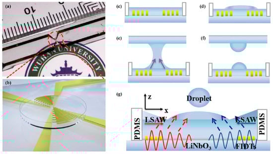In addition to their frequent use in particles and cell manipulation, SAWs are also commonly utilized for driving the trapping [] and splitting [] of liquid droplets in channels as well as for the manipulation [] of sessile droplets, which includes techniques such as translation [], combination [], pumping [,], mixing [,], merging [], atomization [,,,], and jetting [,].