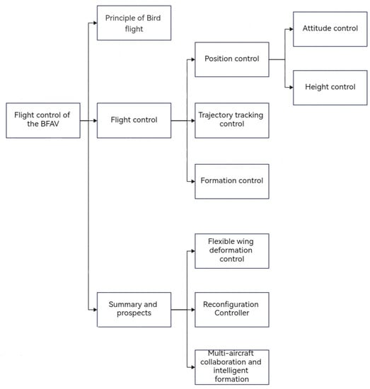 The structure of this essay is as follows (Figure 2). The first part introduces the principles of bird flight. The second part demonstrates the latest development of the BFAV’s flight control algorithm from three perspectives: position control (including attitude control and height control), trajectory tracking control, and formation control, and the third part summarizes the progress of the BFAV and offers a prediction for the future of its research.