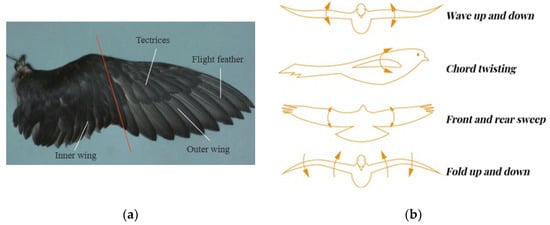 Structure and Schematic Diagram of Bird Wing: (a) Structure of Bird Wing. Reprinted with permission from Ref. [26]. 2022, Chinese Journal of Engineering; (b) Schematic diagram of bird wings waving, twisting, sweeping, and folding. Reprinted with permission from Ref. [29]. 2022, SCIENTIA SINICA Technologica.