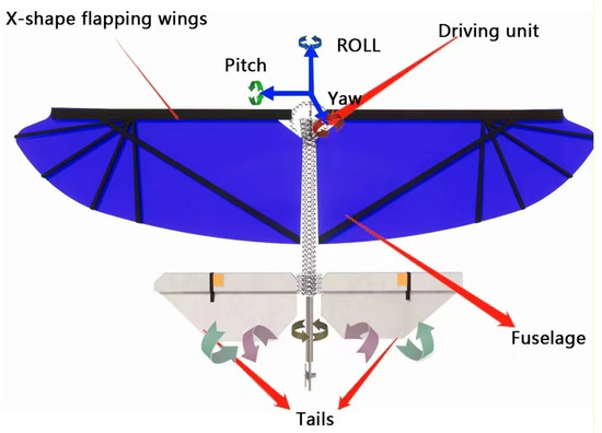 Attitude control is essential for achieving precise orientation and tracking flight for all types of air vehicles [38]. The adjustment of pitch, yaw, and roll attitudes is an integral aspect of attitude control. With the goal of achieving the flapping wing microair vehicle’s (FWMAV) pitch control, Wang et al. have proposed a dynamic linearization approach based on a model-free adaptive control scheme [39]. This approach incorporates an anti-saturation compensator to prevent input saturation, thereby enhancing the efficacy of the model-free adaptive control scheme for pitch control in comparison to conventional methods. Furthermore, Wang et al. have implemented the bionic wing-tail contact mechanism for pitch control through a comprehensive investigation of the biological excitation mechanism. They have established a precise tail control model for the air vehicle and designed a frequency-dependent tail controller [40] that can effectively achieve pitch stability by utilizing the flapping-induced flow. Birds rely on this mechanism for attitude control. Fully referencing it in a flapping-wing air vehicle facilitates the design of the controller and further enhances the bionic level of the flapping-wing air vehicle. Jiao et al. [37] incorporated an X-shaped flap downstream of the main flap for the roll, pitch, and yaw control surfaces on the tail, as well as the tail rotor, as illustrated in Figure 4. The “Northern Hawk” unsteady aerodynamic model was utilized, which accounts for unsteady effects and wing-tail interactions. The pitch torque is produced by the coordinated motion of the two tail control surfaces; the roll torque is generated by the different polarities of the deflection; and a bi-directional controllable tail rotor assembly is installed to actively generate the yaw torque.