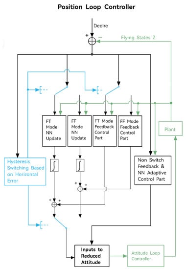 The PID control technique is a conventional method for controlling the height of flapping-wing air vehicles in flight control studies, but its effectiveness is restricted when applied to complex nonlinear systems and complex signal tracking. Consequently, researchers have shifted their focus towards utilizing more advanced control algorithms, such as the adaptable neural network algorithm. In this regard, AI-Mahasneh et al. developed an adaptive control system that employs a generalized regression neural network (GRNN) as the height controller for FWMAVs [52]. Upon comparison with a conventional PID controller, it was discovered that the control performance of the PID deteriorates swiftly with alterations in the input, whereas the GRNN controller can readily adjust to input changes. Furthermore, the performance of the GRNN-based controller enhances over time as the neural network parameters approach the optimal parameters. This substantiates the superiority of the GRNN controller over the classic PID controller. Additionally, Mou et al. conducted a study on the challenges associated with height control in the presence of disturbances [53]. They proposed an active perturbation suppression controller to estimate and suppress both internal and external disturbances, which effectively mitigates overshoot and enhances height control accuracy. In the same year, Qian et al. introduced a novel hybrid neural network-based switching control strategy [54], incorporating a lateral position error switching control strategy and an update strategy for the position controller. Figure 5 displays the system’s block diagram and control task, with “FF mode” denoting the forward flying mode, “FT mode” representing the fine-tuning mode, and “NN” signifying the neural network. The experimental outcomes demonstrate that the proposed strategy effectively stabilizes the flapping-wing air vehicle at the intended 3D location with high dependability and efficacy.
