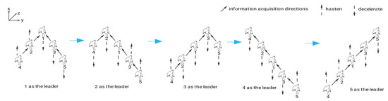 Furthermore, communication and obstacle circumvention have emerged as primary concerns in the realm of formation control. The existing literature has identified artificial potential fields [79] and distributed model predictive control [80] as the predominant approaches employed to address the obstacle avoidance issue. Wu et al. have effectively addressed the obstacle avoidance issue by integrating the enhanced consistency algorithm and particle swarm algorithm to circumvent static obstacles of diverse shapes and the model predictive control concept with the particle swarm optimization algorithm to tackle complex scenarios involving dynamic obstacles [81]. Communication interaction is realized through formation communication, which is contingent upon the formation’s topology. There are two types of topologies in most recent investigations, namely switching topology and fixed topology. However, maintaining a fixed topology for the formation control problem poses a challenge due to factors such as leader failure, constrained communication range, and external interference. Consequently, the topology for the formation control problem is predominantly switched [82]. Yin et al. assert that the information interaction within a flapping-wing cluster is unidirectional, whereby the “follower” receives information from the “leader,” and the “followers” in the rear row receive information from the “followers” in the front row. The implementation of a V-shaped goose formation, as illustrated in Figure 6, involved the alteration of the formation mid-flight to facilitate effective communication and equitable energy distribution during formation flight [83].