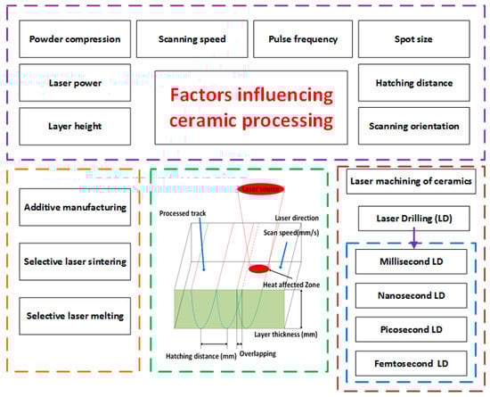The laser output characteristics provided in Table 1 have to be carefully controlled and optimized based on the specific requirements of the laser machining or manufacturing process. Different applications may require different laser sources and output configurations to achieve the desired results. The ability to tailor and manipulate these laser output parameters allows laser machining to be widely used in industries such as aerospace, automotive, electronics, medical devices, and more. High-power, high-density laser beams in direct additive manufacturing are highly utilized for ceramic processing. Selective Laser Sintering (SLS) and Selective Laser Melting (SLM) are the two major and advanced AM methodologies used for fabricating advanced ceramic parts, which are discussed in detail in this paper. The parameters that influence the output quality of this laser processing technique for ceramics are discussed, along with property improvement practices. Further, laser machining, especially laser drilling of ceramics, is also discussed in detail (Figure 1).