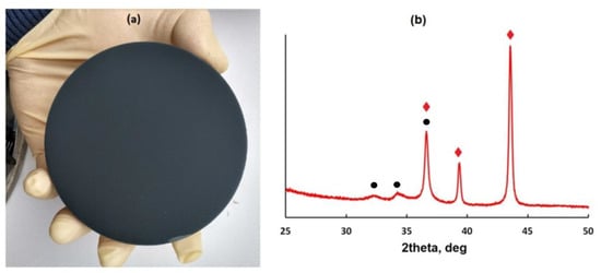The appearance (a) and XRD pattern (b) of the as-deposited Zn–ZnO layer. In the pattern, the peaks corresponding to the Zn metal phase and the ZnO phase are marked with red diamonds and black circles, respectively.