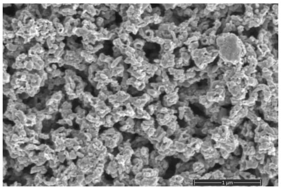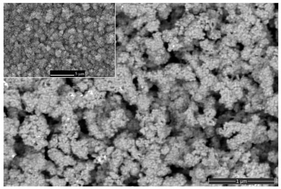 Figure 4 shows the surface morphology of the final porous ZnO layer prepared by annealing the Zn–ZnO composite layer at 400 °C for 1 h. A branched, porous nanostructure of the oxide layer is visible. From the comparison of the morphological characteristics between the as-deposited Zn–ZnO layer (Figure 2) and the annealed ZnO layer, some increase in the average size of aggregated nanograins forming a branched network is observed. However, as can be seen after annealing, the ZnO layer still exhibits an acceptable, high degree of porosity. Therefore, the annealing temperature of 400 °C and duration of 1 h were selected to prepare the “sensitive porous ZnO/QCM” structure by the two-stage technique. In addition, this value of the annealing temperature is noticeably lower than the irreversible phase transition temperature for α-quartz of 573 °C [29].