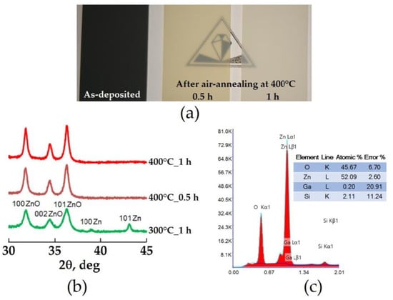 (a)—the appearance of the Zn–ZnO composite layer on glass before (left) and after air-annealing at 400 °C for 30 min (in center) and 1 h (right); (b)—XRD patterns of the Zn–ZnO composite layer after air-annealing at 300 °C for 1 h and 400 °C for 30 min and 1 h; (c)—EDX data for the Zn–ZnO composite layer after air-annealing at 400 °C for 1 h.