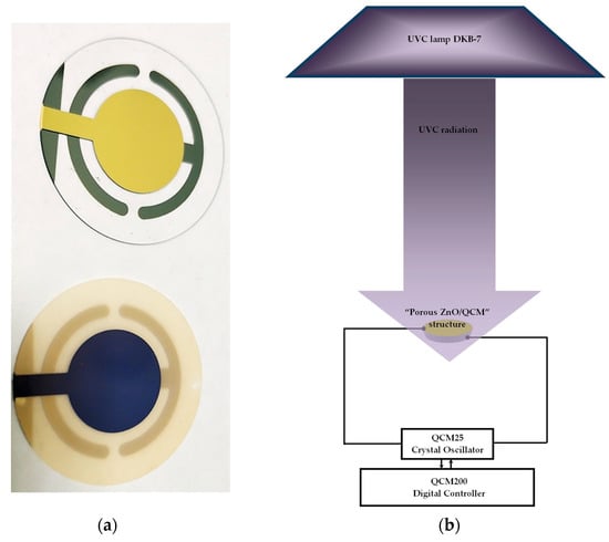 Further, to form the “sensitive porous ZnO/QCM” structure, the ~1 µm thick, porous ZnO layers were deposited on the bare standard QCM plate with an Au electrode pattern from Stanford Research System (USA). Figure 5a shows a visualization of the bare QCM plate and prepared “porous ZnO/QCM” structure, while Figure 5b shows a scheme to investigate the response of the QCM coated with a porous ZnO layer to UV radiation.