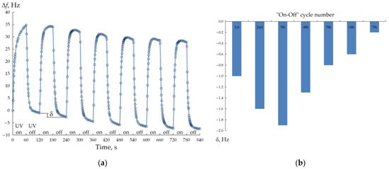 Secondly, when the UV illumination is interrupted, the shift Δf decreases quite quickly and, by 60 s, is below zero, i.e., there is some zero-level drift δ. Thus, the second “on-off” cycle started with a negative value of Δf. Moreover, the drift δ is observed after the completion of each cycle relative to the value at the start of the cycle, and thus the cumulative drift δtotal after nine cycles was 7.4 Hz (Figure 6b). However, it should be noted that the magnitude of the change in the resonant frequency f within each “on-off” cycle did not change (~35 Hz) for all nine cycles performed.