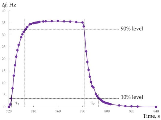 Figure 7 shows the transient response for the 9th “on-off” cycle, which has been corrected for the accumulated drift at the beginning of this cycle (−7.2 Hz) as well as the drift that occurs in the 9th cycle itself (−0.2 Hz). The correction procedure is presented in Appendix A. It can be seen that the frequency shift ∆f quickly reaches a stable value of ~35 Hz at the beginning of the UV light source turning on. This phenomenon can be explained by the fact that the process of the carriers’ generation is saturated quickly in the porous ZnO nanocrystalline layer [38]. From the curve in Figure 7, response time τ1, defined as the time taken for the shift in resonant frequency to change from 10% to 90%, is 11 s.