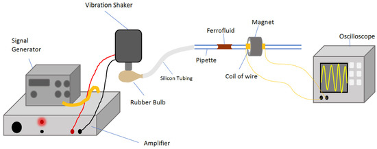 Figure 2 illustrates the experimental test set-up for a ferrofluid energy harvesting device comprised of a pipette, ferrofluid, coil wire, and permanent magnet. The variable frequency amplified vibrational shaker (LDS Permanent Magnet Vibration System V201) compresses a rubber bulb with a stamp that is attached to a pipette filled with a ferrofluid plug which is held stationary in the tube due to capillary action. The compression of the bulb introduces a pressure difference along the capillary pipette resulting in the ferrofluid plug being pushed along the pipette and through a coil of wire, acting as a pickup coil, and wrapped around a section of the pipette. As the bulb is reinflated, the ferrofluid plug is drawn back out of the pickup coil and returned to the equilibrium position. The energy harvesting device was mechanically decoupled from the shaker rubber bulb using a flexible silicone tube (length 1 m), so the energy harvesting device remained stationary while the fluid oscillated inside. The capillary pipette with an inner diameter of 3 mm and outer diameter of 4.5 mm was filled with 1 mL of Ferrotec EMG 707 at a concentration of 2% superparamagnetic Fe3O4 nanoparticles by volume suspended in water. The pipette was closed at the tip with glue so that the forward movement of the fluid acted as a piston compressing the remaining air in the pipette. The retraction of the vibration shaker armature released the compressed air spring, restoring the ferrofluid plug to the equilibrium position and reinstating the rubber bulb. The ferrofluid equilibrium position was set inside the coil so that excitation caused the plug to be pushed out of the coil. Even if the ferrofluid plug reaches different final displacements, the length that travels through the coil is constant due to the constant stroke of the shaker at different frequencies. Hence, only the speed of the plug changes with frequency and not the length. The coil around the pipette was wound with enameled copper wire (AWG 44) double-layer coil with an inner diameter of 5.5 mm and length L = 5 mm, resulting in ~200 turns and DC terminal resistance of 23 Ω. The coil was covered by an axially poled permanent ring-magnet (inner diameter 6 mm, outer diameter 23 mm) with a maximum magnetic field of 11 mT forming the coil/ring-magnet assembly of the energy harvesting device. The terminal voltage was measured with a National Instruments NI-PXI-4461 card in a NI-PXI-1033 (National Instruments, Austin, TX, USA) remote controller chassis at a sampling rate of 2 kHz (labelled ‘Signal Generator’ and ‘Oscilloscope’ in Figure 2) using LabVIEW ver. 2019 with a measurement acuity of ± 3% while employing a low pass filter with a cutoff frequency of 50 Hz.