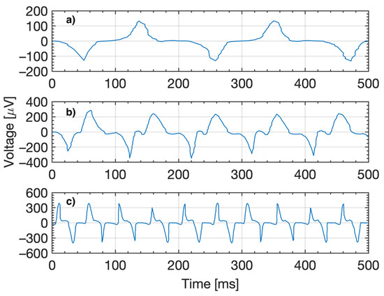 Transient voltage signal from the energy harvesting coil terminals at 5 Hz (a), 10 Hz (b), and 20 Hz (c) drive frequency.