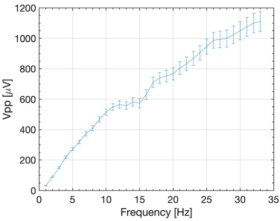 Figure 3a shows the transient voltage signal from the coil terminals at 5 Hz vibration pressure drive frequency. The voltage has one maximum peak and one minimum with a peak-to-peak AC voltage—VPP of 280 µV for every cycle of the induced sine waveform; this represents the movement of the fluid out of the coil followed by the movement in the opposite direction back into the coil. According to Faraday’s law, the direction of the induced current is to oppose the change of flux that induced it. For this reason, the forward and back motion produced a positive and negative voltage amplitude. Figure 3b shows the transient average voltage signal at a 10 Hz drive frequency of 527 µV. At the turning point where the ferrofluid changes direction and moves back into the coil, the signal shows small voltage transient ripples. This can be attributed to the change in velocity and direction not being a smooth process, whereas, during the motion out of and into the coil, the ferrofluid travels smoothly, resulting in a smooth signal through the peaks but a transient signal around the voltage polarity switch. The general shape of the signal is replicated through the different frequencies between 1–30 Hz with very consistent peak-to-peak voltages for low frequencies of <4 Hz and higher frequencies of >10 Hz.