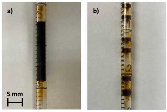 Example photo of the ferrofluid plug inside pipette (a) and after the ferrofluid plug has been pulled apart (b).