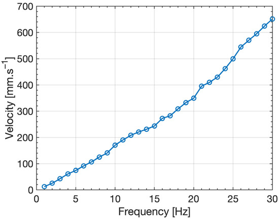 Mean velocity of the ferrofluid plug induced by the shaker against the driving frequency of the vibrational shaker.