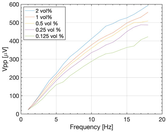 Figure 7 shows peak-to-peak voltage for ferrofluid concentrations of 2 vol%, 1 vol%, 0.5 vol%, and 0.25 vol%. The generated voltage depends on the alternating magnetic flux linkage in the inductive coil (Equation (3)), which is caused by the permeability of the ferrofluid. Diluting the ferrofluid reduces the iron oxide nanoparticles concentration leading to fewer magnetic particles and, therefore, a lower permeability of the fluid. Subsequently, the reduced permeability of the ferrofluid leads to a reduction in VPP induced in the pick-up coil. Diluting the ferrofluid from 2 vol% to 1 vol% reduces VPP from 420 µV to 380 µV. On the other hand, it is assumed that increasing the concertation of the ferrofluid would increase the voltage output of the energy harvesting device. This provides an interesting optimization approach for upscaling this device by utilizing ferrofluids with higher concentrations and higher surface tension (Equation (1)) for larger changes in magnetic flux. Future work will focus on stable concentrations of high-density ferrofluids in order to harvest more electrical energy from external vibrations. Future work will also focus on the fluid dynamic analysis (e.g., friction, drag, resonance) to better understand why the plug splits into smaller plugs and on random vibrations sources, which has not been explored for reasons of simplicity. On the other hand, the unique advantage of the here proposed energy harvesting design is the not-reliance on resonance operation conditions. Subsequently, it does not need to conform to certain geometries and masses as long as capillary action is possible. In addition, the vibration source can have any confined shape as long as it can be transferred into a pulsating change in volume. When scaling the proposed energy harvesting device, multiple magnet-pick-up coil assemblies can be placed on a single capillary tube significantly improving the energy harvesting output.
