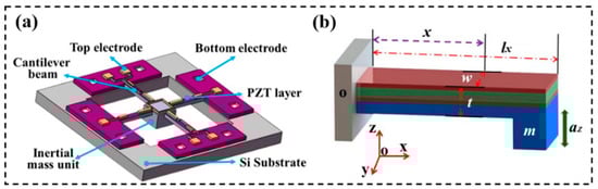 Currently, there are three types of MEMS accelerometers: piezoresistive [11], capacitive [12], and piezoelectric [13]. The piezoresistive MEMS accelerometer is an early developed type of miniaturized accelerometer. It consists of a cantilever beam with a piezoresistive material and an inertial mass unit, which possesses the advantages of simple structure and relatively easy fabrication. However, the large temperature coefficient of the piezoresistive material results in the sensitivity of the acceleration detection performance to temperature and the poor anti-interference ability. Additionally, it has low sensitivity, significant hysteresis effects, and a high-power dependence, making it difficult to apply to underwater scenarios with high requirements for sensitivity and accuracy [14]. The capacitive MEMS accelerometer uses variable capacitors as sensing components and has the advantages of high sensitivity, simple structure, low noise, and low temperature sensitivity, whereas it is susceptible to parasitic capacitance interference and requires complex detection circuits. Additionally, the non-linear effect of the capacitive accelerometer structure is significant at large displacement, limiting its linear dynamic testing range [15]. Unlike piezoresistive and capacitive sensors, the piezoelectric MEMS accelerometer is a passive device that requires no external power supply. It exhibits excellent piezoelectric coupling, high quality factor, wider linear amplitude range, and lower power consumption, making it widely used in marine resource exploration and inertial sensing systems [16]. Piezoelectric MEMS accelerometers commonly use lead zirconate titanate (PZT), zinc oxide (ZnO), and aluminum nitride (AlN) as thin film materials for electromechanical conversion. As three kinds of typical piezoelectric materials, the piezoelectric coefficients d31 of AlN and ZnO thin film is 3.4~6.4 pC/N and 5.9~12.4 pC/N, respectively [17]. However, the piezoelectric coefficients d31 of PZT thin film with high energy density and output voltage is up to 60~223 pC/N [18], tens of times higher than the value of AlN and ZnO. PZT has gained significant interest due to its high dielectric constant, low cost of fabrication, good piezoelectric properties, and convenience to be incorporated into MEMS accelerometers. Several studies have been carried out on piezoelectric MEMS accelerometers. Between 2006 and 2010, Hinichsen et al. [19,20,21] developed a series of PZT piezoelectric accelerometers based on beam structure and the inertial mass unit. Firstly, they fabricated and characterized a micromachined accelerometer with four beams and four inertial unit structures. Subsequently, they presented a theoretical model of a PZT MEMS accelerometer based on four-cantilever beams and single inertial unit. In 2019, Xu et al. [22] fabricated a PZT four-cantilever beams accelerometer with interdigital electrodes structure. The results indicated that a higher voltage output can be achieved with a smaller filling and electrode interspace. Recently, in 2021, Lee et al. [23] proposed and fabricated a piezoelectric MEMS accelerometer on Si substrates using photolithography and sol-gel PNZT. The accelerometer exhibited a sensitivity of 16.8 mV/g at 200 Hz. According to the above research, the four-cantilever beam structure has advantages, such as high sensitivity, wide frequency range, improved linearity, low power consumption, and easy fabrication, making it a popular choice for piezoelectric accelerometers used in various applications [8].