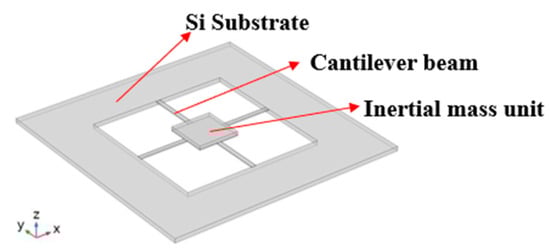 To consider the performance of the microstructure before fabrication, Finite Element Analysis was performed using COMSOL Multiphysics 6.1 software, as shown in Figure 4. In the design of beam and inertial mass unit structure, not only the material settings, but also the physical settings of the Multiphysics simulation interface of the piezoelectric components are used; the simulation parameters of the principal material are listed in Table 1.