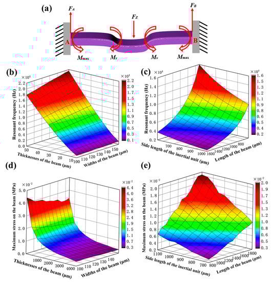 The effects of microstructural parameters on the resonant frequency and maximum stress: (a) the force analysis and deflection diagram of the microstructure, (b) relationship of the resonant frequency on the width and thickness of the beam, (c) relationship of the resonant frequency on the beam length and the inertial mass unit, (d) relationship of the maximum stress on the width and thickness of the beam, (e) relationship of the maximum stress on the beam length and the inertial mass unit.