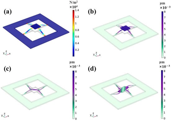 Modal analysis using COMSOL Multiphysics: (a) the deformation and stress distribution of the microstructure, (b) the 1st-ordered resonance, (c) the 2nd-ordered resonance, and (d) the 3rd-ordered resonance.