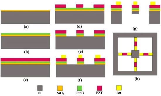 Fabrication scheme of the MEMS piezoelectric microstructure: (a) SiO2 grown by thermal oxidation. (b) Pt/Ti sputtered onto the SiO2/Si substrate. (c) PZT grown by sol-gel combined with the annealing process. (d,e) PZT, Pt/Ti, and SiO2 pattern produced by photolithography and IBE. (f) Au/Ti was sputtered, followed by a peel-off process. (g,h) Cantilever beams and mass fabrication using lithography and etching by the RIE process.