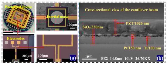 Morphological characterization of the PMA: (a) photos of the packaging equipment, indicating the electrodes on the base and cantilever beam, respectively, and (b) SEM images of cantilever beam cross-section, representing different thicknesses of PZT, Pt/Ti, SiO2, and silicon wafer layers, respectively.