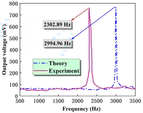 The resonance frequency of the PMA is shown in Figure 10. The output of the PMA increases with increasing frequency and reaches its maximum value at about 2300 Hz, indicating that this frequency is the resonant point of the PMA. After passing through the resonant point, the output voltage drops sharply. Nevertheless, there is still a certain difference between the measured and designed target frequency of about 3000 Hz. This difference may be attributed to the MEMS fabrication process, where there is a certain difference between the actual geometric dimensions and the designed ones of the cantilever beams and the central inertial unit. It is impossible to achieve a rigid installation between the sensor and vibration platform. In addition, the damping coefficient around the encapsulated acceleration sensor in air may also cause the frequency difference mentioned above [34]. In any case, the resonant frequency results prove the effectiveness of our designed accelerometer.
