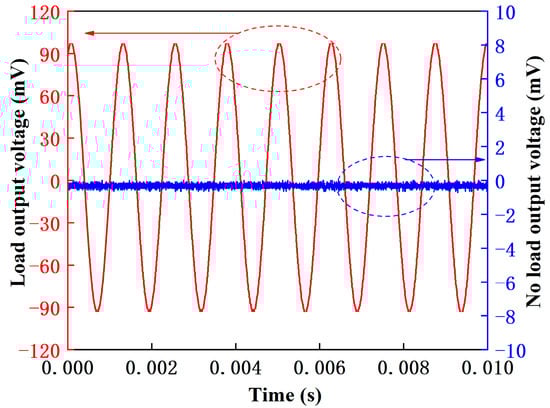 A single cantilever beam was analyzed to study the noise impact of PMA that was measured on a vibration testing system. The accelerometer was installed on the excitation platform to test the sensor frequency response under load. On the other hand, the sensor was tested without being installed on the excitation table to measure its frequency response under no load. Under a 1000 Hz vibration frequency input, the results of the noise signal and output electrical signal comparison test are shown in Figure 11. The blue curve is for the no-load condition, and the peak-to-peak voltage value of the testing system is about 86 μV. The red curve is for the load condition, and the peak-to-peak voltage value of the piezoelectric element is about 183.4 mV, which is much larger than the output voltage value under no load, differing by about three orders of magnitude. The PMA is a passive piezoelectric sensor, and noise mainly comes from the testing system. The noise is relatively small compared to the output signal, so it can be ignored. The noise has little impact on the output signal of the piezoelectric element, demonstrating good anti-interference ability and reducing the influence of the noise gradient in the environment on the sensor detection performance.