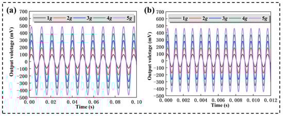 Output voltage curves of the PMA under different accelerations from 1 g to 5 g at (a) 100 Hz and (b) 1000 Hz.