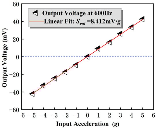 Finally, sensitivity testing was performed on the accelerometer. The vibration platform was set to start from 0 g and gradually increase to 5 g in steps. Each acceleration value was loaded with a negative acceleration measurement for 2 min in the same way, i.e., applying −5~5 g acceleration to the sensor under testing. The output voltage results at each acceleration were exported from the data interface of the digital oscilloscope. Then, the data were linearly fitted using the least squares method, and Figure 13 shows the output curve of the test, which shows the relationship between the output voltage and PMA values. The relationship between the output voltage of a single cantilever beam and the acceleration value is plotted at an excitation frequency of 600 Hz. The results showed that the input acceleration and output voltage of the PMA had a linear relationship, and the function expression was V = ka + Vo = 8.412a − 0.212 (where k is the slope of the line, and Vo is the voltage intercept). The linear correlation coefficient R2 of the sensor’s single cantilever beam was 0.9997, approaching 1. Therefore, the sensor has good acceleration response linearity and passive stability. The slope is equal to its prime sensitivity, which measures the output voltage per unit of gravitational force applied. In this case, the slope is found to be 8.412 mV/g for a single beam. Hence, since all four beams on the accelerometer are coupled in parallel, the sensitivity of the entire sensor is 33.65 mV/g.