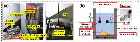 Measuring calibration system of the PVH: (a) test calibration system, (b) schematic diagram of hydrophone calibration device.