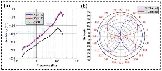According to Equation (19), the sensitivity of the PVH can be obtained, and the sensitivity curve can be plotted based on the data. Figure 15a shows the x-axis and y-axis frequency response curve of the PVH. It can be seen that the PVH has good low-frequency characteristics, with a sensitivity of −178.99 dB@1000 Hz (0 dB = 1 V/μPa) and a frequency bandwidth of 20~1100 Hz, 11 dB higher than the bionic cilia MEMS vector hydrophone (CVH) at the same frequency [7], suitable for quiet underwater applications.