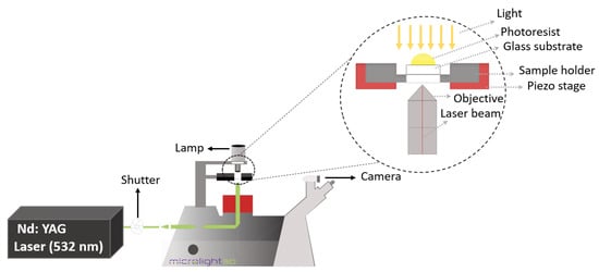 A MicroFAB-3D printer (Microlight3D, La Tronche, France) was used for printing micropillars. The 532 nm laser beam, generated by a sub-nanosecond pulsed Nd:YAG laser, passes the shutter and the optical pathway to the objective which focuses the beam inside the photoresist. A lamp illuminates the sample from the top. A glass coverslip, on it a small drop of photoresist, is attached to the sample holder which is laying on the piezo stage. The laser beam hits the photoresist from the bottom of the glass. To protect the eyes of the operator, a filter is put on top of the sample stage (see Figure 1).
