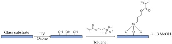 For the surface modification of the glass substrate, 22 mm × 22 mm glass slides were cleaned for 20 min in a BioForce Nanosciences UV/OZONE ProCleaner Plus. Afterwards the slides were immersed for 24 h in a functionalization solution consisting of 60 mL toluene and 1 mL of 3-(Trimethoxysilyl)-propyl methacrylate. The glass slides were taken out of the solution and washed with toluene and ethanol in order to remove any residues (see Figure 2).