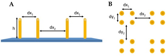 The 3D model file of the pillars was generated as a .txt file using a Python 3.11.4 program. Parameters that could be adjusted include the distances between the pillars in the x-direction dx1 and dx2 and between the pillars in the y-direction dy1 and dy2. Furthermore, the number of pillars in x-direction N-obj-x and in y-direction N-obj-y and the height h of the pillars could be set as it is shown in Figure 3.