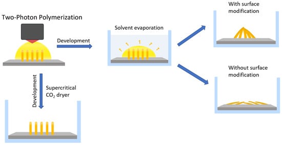 Although the TPP can generate micropillars, it faces a number of challenges. One of these challenges is capillary force, which can result in significant defects, such as deformation or collapse [43]. Capillary forces are typically generated due to the evaporation during the final step of the microstructure development process by a solvent [44,45,46,47]. It is possible to reduce capillary forces by altering the substrate by surface modification or using different drying methods [48]. Liquids with low surface tension, such as isopropyl alcohol (IPA), can reduce capillary forces, but this approach shows limited improvement for nanostructures with moderate aspect ratios [49,50]. Further increasing the aspect ratio can cause the same deflection, and IPA cannot prevent HAR nanostructure clustering. An effective method for drying is supercritical drying, which involves increasing the temperature and pressure of the environment beyond the critical point and causing the liquid to reach the supercritical phase [51]. Pattern collapse can be suppressed most effectively by reducing surface tension. Using a supercritical carbon dioxide (CO2) dryer for a final development process, which has no surface tension, can allow the formation of fine micropillar patterns. As a result, nanostructures do not experience capillary forces [48,49,52].