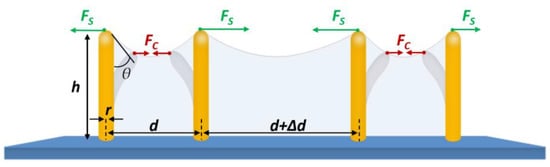 where E is Young’s modulus and h is the pillar height. There is a critical distance dc below which neighboring pillars can be assembled or otherwise remain upright when the capillary force and the restoring force are balanced. When d is lower than dc, neighboring pillars can remain in contact by capillary forces FC during solvent evaporation or by short-range van der Waals forces FV in the air for a given pillar height [54].