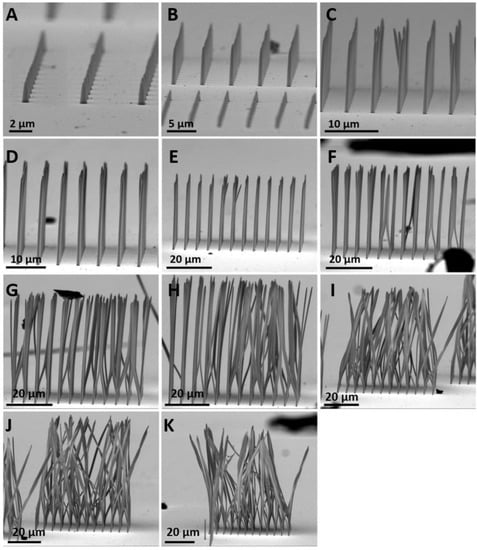Figure 8 shows SEM images with an approximate tilting of 90° of micropillars with different aspect ratios. The aspect ratio of the micropillar was measured by dividing the height of the pillar by its diameter h/2r (see Figure 5). Due to the instability of pillars over 30 µm in height and less than 1 µm in diameter, micropillars with aspect ratios up to 40 did not remain completely upright. The very HAR of 80 that is shown in Figure 8H was obtained in this study. To the best of our knowledge, this is the highest aspect ratio of polymeric micropillars obtained to date using the TPP technique. Micropillars with a height greater than 50 µm can be observed in Figure 8H–K. The SEM images show that most of the micropillars are bent after development by the supercritical CO2 dryer. These micropillars have HARs of 80, 83, 90, and 101, respectively. In the supercritical CO2 dryer, due to the absence of surface tension, γ = 0 and thus resulted in FC = 0 (see Equation (1)). This result indicates that the bending of pillars that are shown in Figure 8F–K are not provoked by the capillary force. It is believed that the bending is due to the turbulences induced by the introduction of liquid CO2 into the chamber to replace ethanol. These turbulences can cause pillars with a high height (over 40 µm) to bend. Due to the non-stand-up micropillars, the average height of all structures was not measured; the approximate numbers of the diameters and heights are listed in Table 1. Additionally, the three arrays of pillars in Figure 8A–E are properly defined and no collapsing can be observed between them.