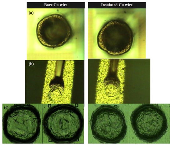 Comparison of bare Cu and insulated Cu wire bonded samples. (a) Ball bond, (b) stitch bond, and (c) IMC coverage and pattern [36].