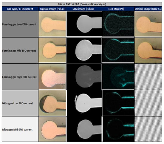 FAB refers to the formation of a free spherical structure of air during the metal bonding process. FAB has a significant impact on the reliability of the bond, with the most prominent influence being on bond strength. A uniform and stable FAB facilitates the formation of a robust solder joint, leading to enhanced bond reliability. Researchers such as Hong Meng Ho et al. [44] have studied the ball formation properties of Cu wire and found that a larger Electronic Flame Off (EFO) current or shorter ball formation time results in better control of FAB diameter standard deviation. The study also revealed a correlation between the hardness of Cu solder balls and EFO parameters, indicating that higher EFO currents lead to a softer FAB. For Cu wire bonding, to obtain a softer FAB and minimize stress during the initial bonding impact, it is advisable to form a FAB within a shorter current-on time. A.B.Y. Lim et al. [45] compared the formation of a FAB and differences in wire bonding between PCC and bare Cu wire, as shown in Figure 3. It was observed that under varying gas types and EFO currents, PCC wire exhibited the formation of irregular solder balls. The distribution of Pd on the FAB was also influenced by the type of protective gas and EFO current, with the EFO current being the primary factor. Adjusting the EFO current resulted in different Pd distributions. The study further observed gaps in the bond interface after PCC wire bonding, and these gaps were closely related to the presence of Pd, as depicted in the figure. After annealing PCC bonds for 24 and 168 h at 175 °C, two layers of IMCs were observed. The experimental findings had significant implications for understanding the mechanism of gap formation at the bond interface due to Pd distribution and the impact of a FAB on wire bonding reliability.