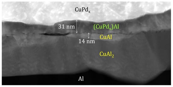 Various phases of Cu-Al IMCs have been identified as CuAl2, CuAl, Cu4Al3, Cu3Al2, Cu9Al4, and Cu3Al [56,57,58,59]. Through experiments, KIM H G et al. [60] found that Cu-Al IMCs form in the order of CuAl2, CuAl, and Cu9Al4 in Cu-Al wire bonding, whereas Cu-Au IMCs form in the order of (Au, Cu), Cu3Au, and (Cu, Au). The atomic diffusion between Cu and Au and the volume difference of IMCs result in the formation of voids near alumina fragments. Cu-Al IMCs’ TEM image is shown in Figure 5. Through the analysis of the complete IMC at the bonding interface, Chien-Pan Liu et al. [61] discovered that the ball bond interface between the Cu wire and Al-bonding pad consists of layered structures composed of Cu, Cu9Al4, CuAl2, and Al. They also found that bonding failures frequently occurred between the Cu9Al4 and CuAl2 layers due to high current corrosion rates and the presence of high-concentration interfacial voids, which aligned with the previous findings on IMCs. They further developed a predictive model for IMC growth in Cu wire processing technology, which could help reduce Cu-Al interface failures in practical applications. T. Joseph Sahaya Anand et al. [62] bonded Cu wire to interfaces of Al, AlSiCu, and NiPdAu pads, and it was observed that the growth rate of IMCs followed the sequence Al > AlSiCu > NiPdAu. They also found that a faster IMC growth rate led to accelerated crack formation. Hyun-Woong Park et al. [63] studied the effects of Pd and Pd-Au coatings on Cu wire bonding. The results showed that noble metal coatings formed a fully solid solution at the Cu-Al bonding interface, potentially impeding the diffusion of Cu-Al IMCs, especially at the Cu9Al4 IMC, which may delay the IMC growth rate [64]. The formation of a fully solid solution is believed to enhance the bonding reliability by protecting the IMCs from crack propagation. Adeline B. Y. Lim et al. [65] found that CuAl exhibits the highest hardness and stiffness among Cu-Al IMCs. Cu9Al4 is the most susceptible to corrosion among IMCs in Cu wire bonding, whereas CuAl2Cu shows better corrosion resistance [66]. One of the failure factors in wire bonding components is the corrosion of the intermetallic layer [67,68].