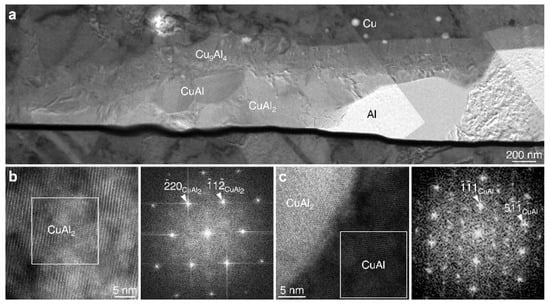 (a) BF TEM image of the fully consumed Al interface between the Cu-bonding wire and the Al pad after aging at 175 °C for 2000 h. HRTEM images of (b) CuAl2 and (c) CuAl grains, and FFT images of the area marked a white square in (b,c) [60].