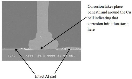 Cross-sectional analysis of Cu ball on Al pad revealing corrosion initiation beneath the Cu ball [70].