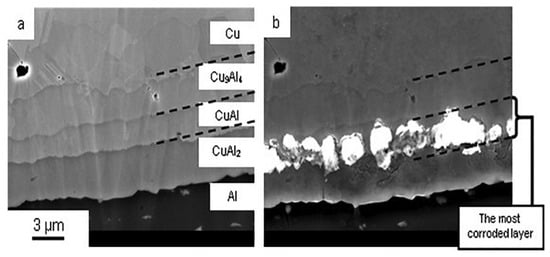Cross-section of Cu/Al IMCs (a) before immersion in NaCl solution and (b) after immersion in NaCl solution [73].
