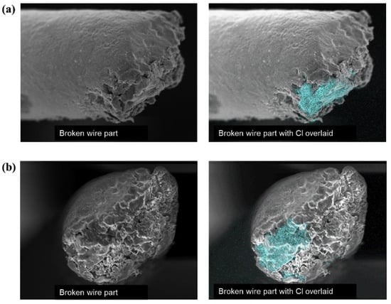 SEM/EDX mapping image of broken stitch Cu wire with chloride distribution. (a) Side view and (b) front view [74].
