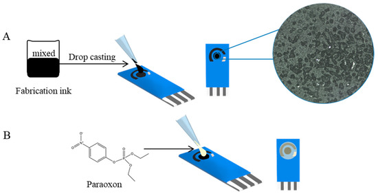 The preparation process for electrochemical analysis. (A) Preparing the working electrode and (B) pesticide solution to quantitatively detect paraoxon on the screen-printed carbon electrode.