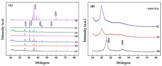 (A) XRD spectra of (a) 1:1:0—Cs (High), (b) 1:1:0—Cs (Med), (c) 1:1:1—Cs (High), (d) 1:1:1—Cs (Med), (e) 1:1:0.5—Cs (Med), (f) synthesis AgNPs, and (g) pure SiC. (B) XRD spectra of commercial (h) MWCNTs, (i) chitosan—Cs (Med), and (j) chitosan—Cs (High). Note that (*) represents the (002) plane of the MWCNTs’ position.