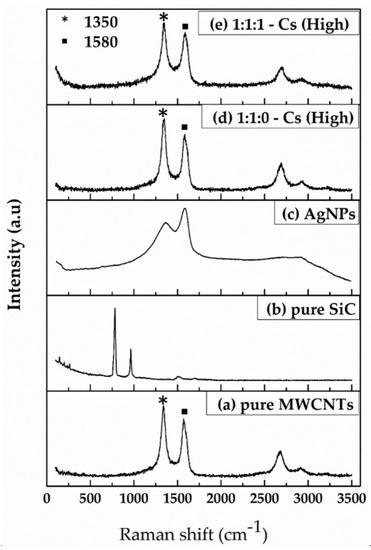 Raman analysis was used to study the presence of defects and crystal structure in the case of CNTs. Figure 3 shows the Raman spectra of (a) pure MWCNTs, (b) pure SiC, (c) pure AgNPs, (d) 1:1:0-Cs (High), and (e) 1:1:1-Cs (High). The stretching of the C-C bond in graphitic materials gives rise to the so-called G-band Raman feature, common to all sp2 carbon systems. The G-band indicates stress caused by external forces acting on the structure of multi-walled carbon nanotubes. G-bands are observed at approximately 1580 cm−1. Another important band in the Raman spectra of the investigated nanotubes at around 1350 cm−1 was observed, known as the D-band. The disordered structure of graphene sheets causes the D-band, and the 2D-band is approximately 2700 cm−1 [35,36], in which only the D- and G-bands of carbon were detected. The Raman shift spectra of SiC are observed at 790, 970, and 1500 cm−1. The fabricated ink showed SiC peaks disappearing; this is because the Raman scattering of carbon is at least 10 times higher than that of SiC [37,38]. After adding AgNPs, it was observed that its intensity is further enhanced in the case of AgNps/MWCNT composite, assuring the attachment of AgNPs as more defects have been incorporated by the binding of AgNPs onto MWCNT, justifying the synthesis of AgNPs/MWCNT/Cs composite.